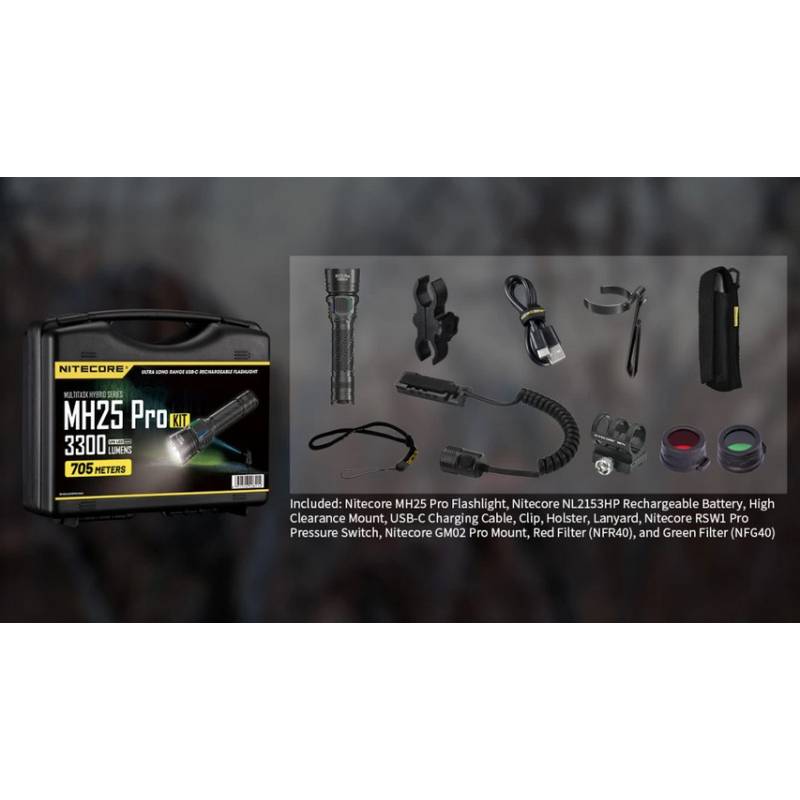 Set je účelne navrhnutý pre poľovníctvo. Obsah setu: svietidlo MH25 PRO, diaľkový spínač, akumulátor, magnetická montáž, filter červený a zelený.- Používa vysoko kvalitnú NiteLab UHi 40 LED. - Maximálny výkon až 3300 lúmenov. - Vysoko efektívna elektronika.- Maximálna prevádzková doba až do 650 hodín. - Inteligentný nabíjací obvod s detekciou napätia, nabíja bezpečne a rýchlo.- Integrovaná zásuvka USB-C je odolná voči vode, prachu a nárazu.