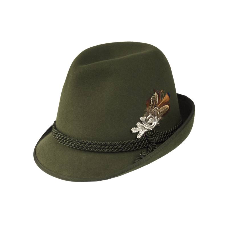 Pánsky poľovnícky klobúk zdobený točenou šnúrou, bižutériou a perím, kožený potný pásik. Výrobok obsahuje netextilné časti živočíšneho pôvodu.