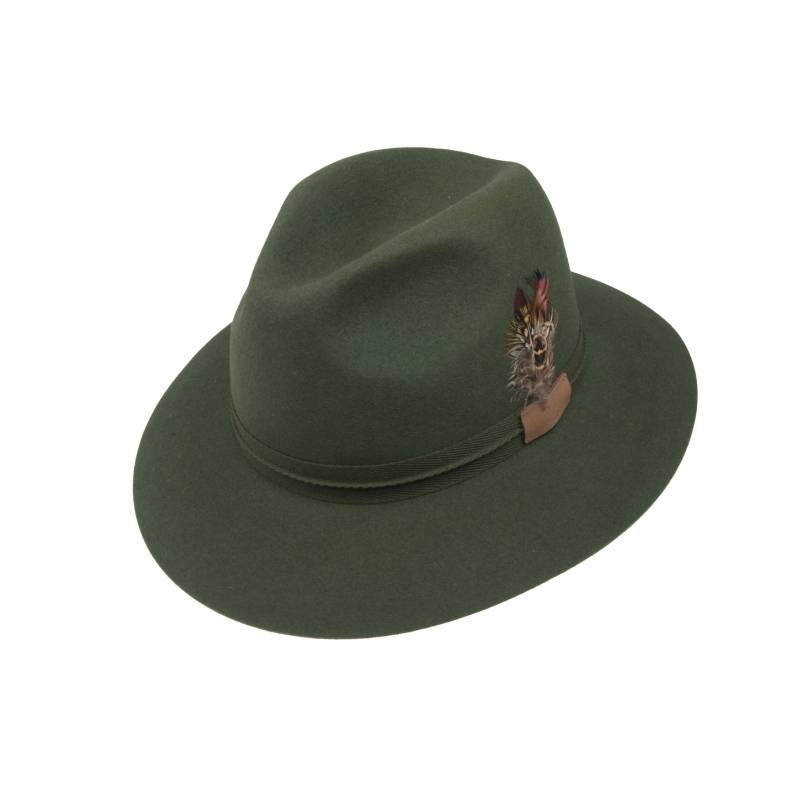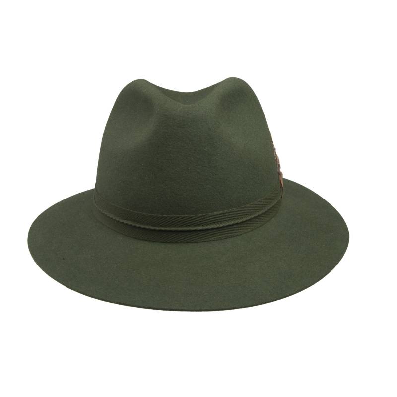 Pánsky poľovnícky klobúk s tkanou stuhou zdobenou kožou a perím, kožený potný pásik. Výrobok obsahuje netextilné časti živočíšneho pôvodu.