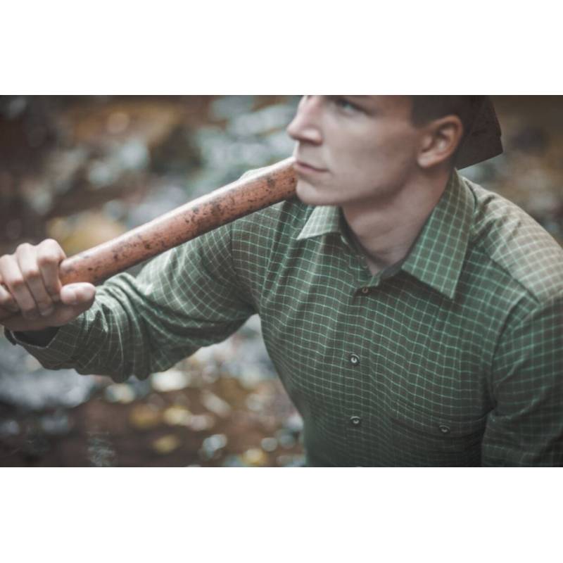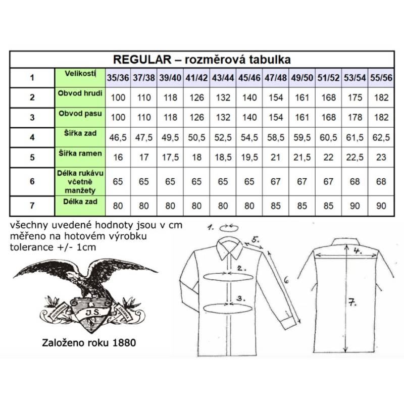 Košeľa má klasický rovný strih REGULAR, jedno vrecko na ľavej strane so zapínaním na gombík. Gombíky sú stálofarebné, majú dlhú životnosť a sú vyrobené z imitácie parožia.