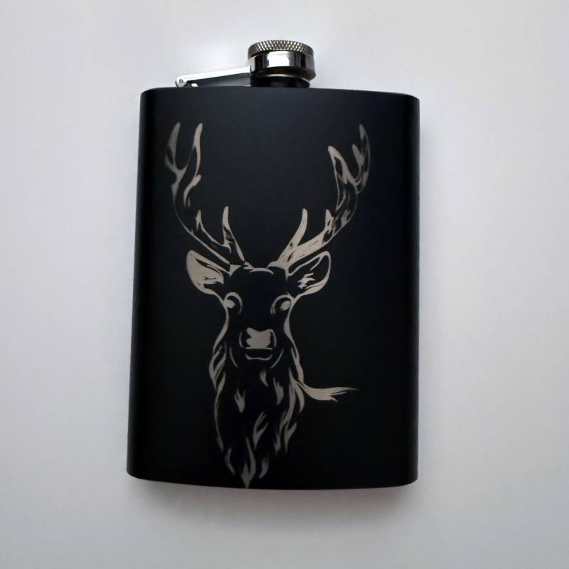 Čierna nerezová ploskačka s gravírovaným motívom jeleňa. Pevný uzáver umožňuje krátkodobý prenos alkoholických nápojov v objeme 240ml. Ideálny darček k narodeninám pre rybárov a poľovníkov, ktorí trávia dlhé večery čakaním na svoj úlovok.