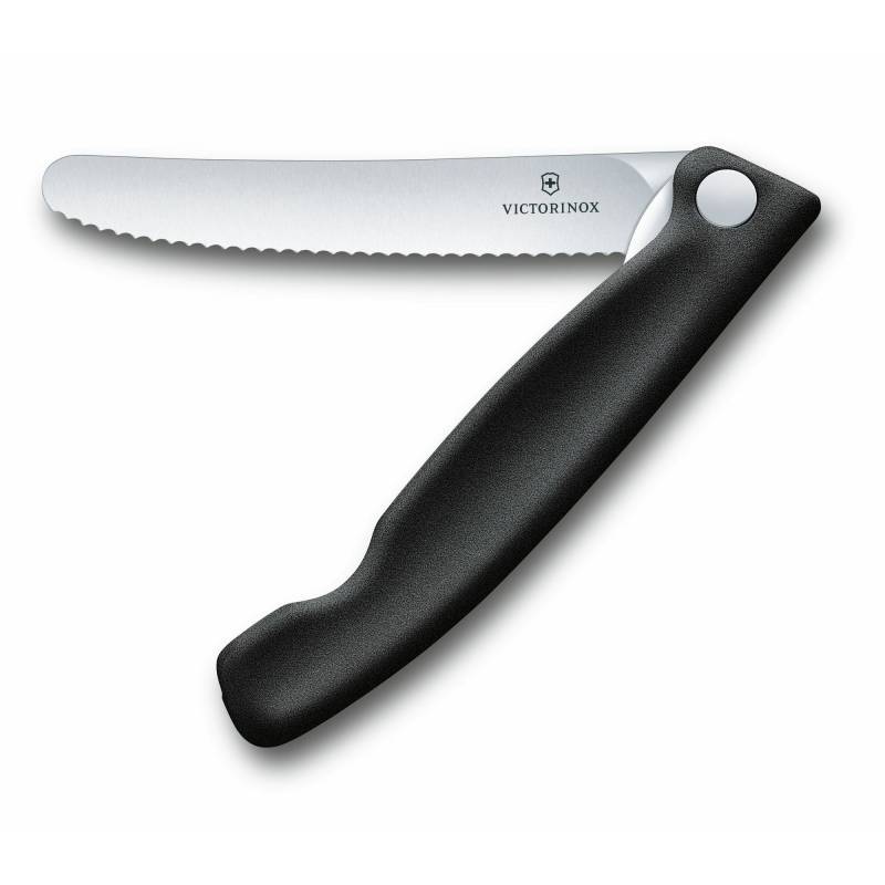 Nóž na skladanie mäkkej zeleniny a ovociaóž s čiernou rukoväťou od Victorinox. Ideálny na krájanie a lúpanie mäkkej zeleniny a ovocia, napríklad paradajok. Skvelé na použitie v teréne, mimo kuchynského zariadenia. Zúbkovaná, sklopná čepeľ s dĺžkou 11 cm je vyrobená z valcovanej nehrdzavejúcej ocele so zvýšenou pevnosťou, takže jeódlho ostrá. Rukoväť noža je vyrobená z polypropylénu v čiernej farbe. Vďaka ergonomickému tvaru rukoväte nôž dobre sedí v ruke, čo zvyšuje pohodlie. Môže sa umývať v umývačke riadu.